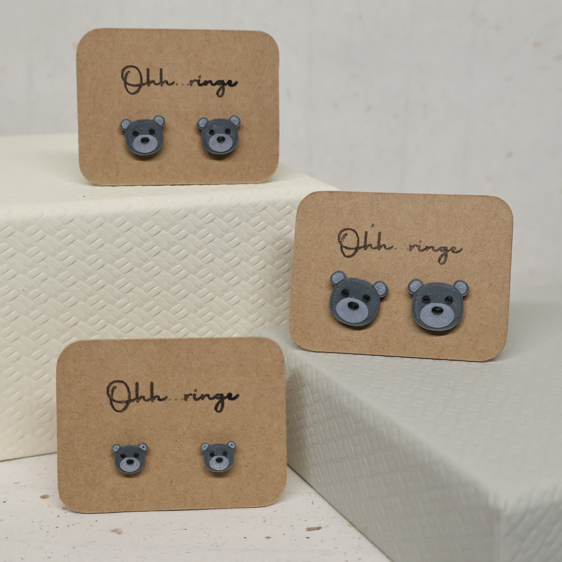 Pendientes impresos en 3D con filamento biodegradable (PLA), perno de plástico y cierre de silicona.