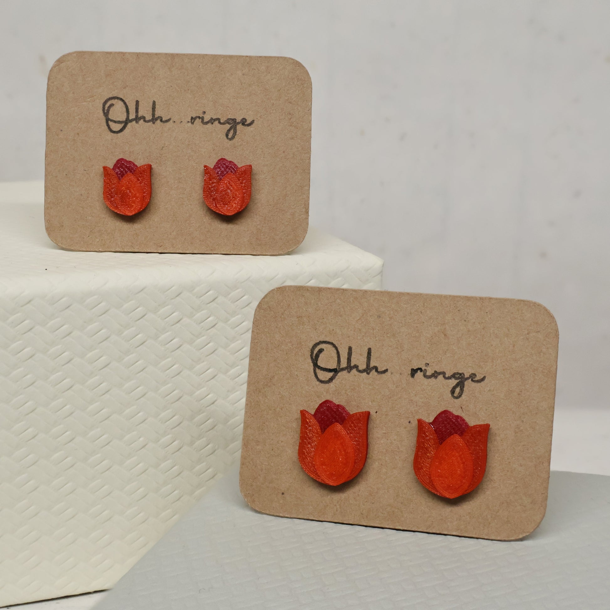 3D-gedruckte Ohrringe mit biologisch abbaubarem Filament (PLA), Kunststoff-Stift und Silikonverschluss.